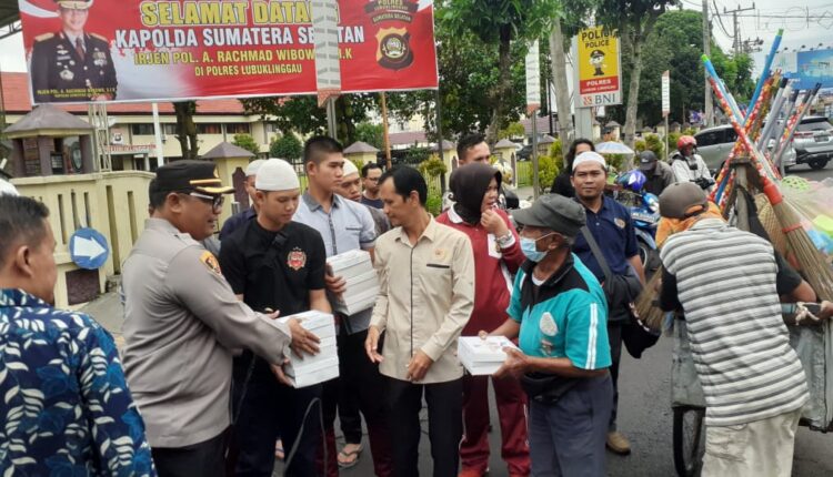 LUBUKLINGGAU— Jum’at Barokah, Kapolres Lubuklinggau AKBP. Harissandi dan PWI Lubuklinggau membagikan nasi kotak kepada masyarakat yang kurang mampu. Terutama untuk Tukang ojek, pedagang kaki lima, tukang parkir, yang berada di sekitar Mapolres dan Masjid Agung Al-Baari Lubuklinggau, Jum’at (24/02/2023).