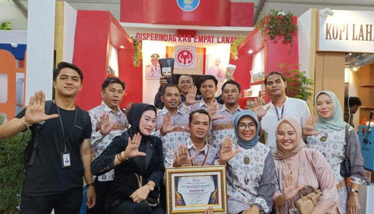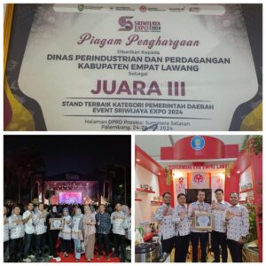 MEDIAEMPATLAWANG.Palembang— Dinas Perindustrian dan Persagangan (Disprindag) Empat Lawang, Ikuti Event Expo Sriwijaya 2024. Dalam kegiatan tersebut Empat Lawang berhasil sabet juara III kategori stand daerah terbaik. Dari 17 Kabupaten Kota di Sumatera Selatan. Dan beberapa stand instansi BUMN dan UMKM.