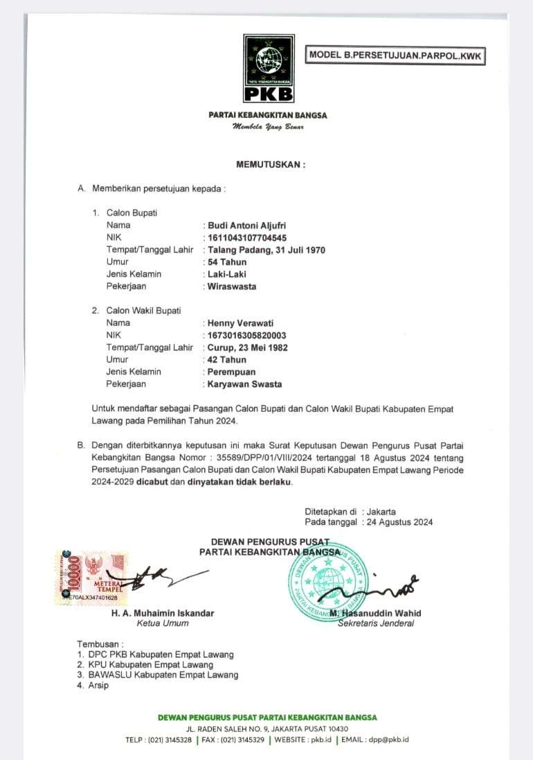 Sementara, Partai Kebangkitan Bangsa mencabut dan menyatakan tidak berlaku Surat Keputusan DPP PKB Nomor : 35589/DPP/01/VIII/2024 tanggal 18 Agustus 2024 dan sekaligus mendukung, mengusung dan mengusulkan H. Budi Antoni Al Jufri, SE dan Henny Verawati, SE, MM untuk mendaftar sebagai Pasangan Calon Bupati dan Wakil Bupati Empat Lawang Tahun 2024 berdasarkan Surat Keputusan DPP PKB Nomor : 36420/DPP/01/VIII/2024 tanggal 24 Agustus 2024 bersama dengan Gabungan Partai Politik lainnya sehingga melebihi ambang batas 8,5% sesuai peraturan perundang-undangan ;