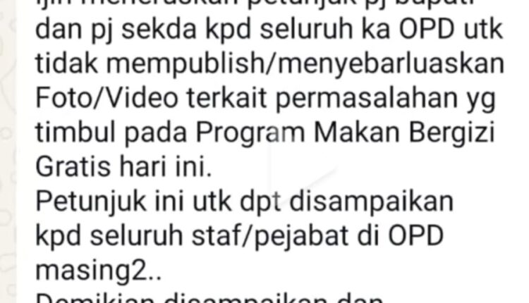 MEDIAEMPATLAWANG— Beredar luas di publik melalui via WhatsApp ada perintah dari Pj. Bupati Empat Lawang dan Pj.Sekda. Terkait insiden Makan Bergizi Gratis (MBG). Yang terkesan melarang seluruh OPD secara luas Aparatur Sipil Negara (ASN) untuk mengomentari dan menjadi menyebarluaskan informasi insiden tersebut.