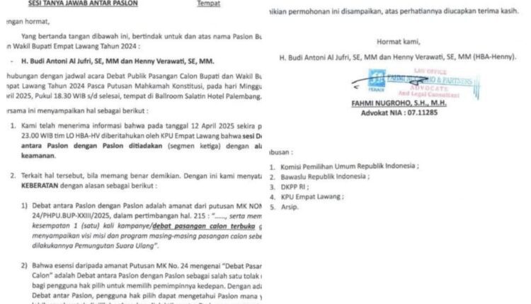 Fahmi menguraikan. Salah satu hal yang nyata. Bahwa putusan MK yang diabaikan adalah Sesi Tanya Jawab Antar Paslon. Dalam acara debat yang diselenggarakan di Palembang disalah satu Hotel. Pada malam Tanggal 13 April 2025. Kalau hal itu ditiadakan dengan berbagai alasan kekhawatiran terjadinya keributan atau alasan lainnya. Itu sepertinya sangat tidak relevan. Maka dari itu pihaknya sudah melayangkan surat keberatan ke pihak KPU dan Bawaslu Sumsel atas tindakan tersebut. Kemudia surat tersebut ditembuskan ke KPU RI, Bawaslu Ri. DKPP RI. Dan KPU Empat Lawang.